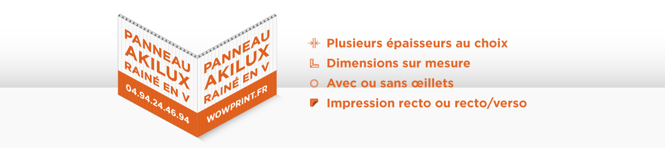 Pour toutes vos impressions sur panneaux Akylux ® , vous pouvez choisir les options que vous souhaitez (coupe, œillets, perforations) suivant l’utilisation. De plus, vous pouvez faire une demande de devis personnalisé sur notre site ou directement par email auprès de nos conseillers au 0494244694. Renseignez les spécifications techniques de votre panneaux Akylux ® , confirmez votre commande et envoyez votre fichier d’impression depuis votre Espace Client. WOWPRINT se chargera du reste ! Nous livrons vos panneaux Akylux ® personnalisés dans toutes les régions de France métropolitaine et les grandes villes comme Paris, Marseille, Lyon, Toulouse, Nice, Nantes, Montpellier, Strasbourg, Bordeaux, Lille, Toulon.