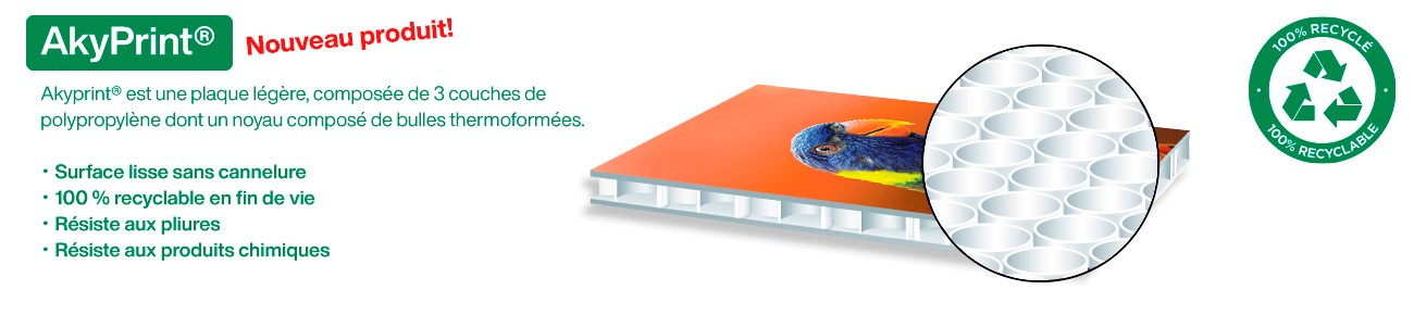 AkyPrint® est issu d'une toute nouvelle génération de panneau alvéolaire en polypropylène. Ses meilleurs atouts : c'est un support 100% recyclable, extrêmement léger et résistant à la déchirure, l'humidité et les agents chimiques. Aucun effet de cannelure n'est présent dans ce support. En effet, sa structure à bulles et l'absence de relief en font une alternative idéale pour un engagement fort en faveur des matériaux d’impression durables. Son noyau plus dense que les panneaux alvéolaires classiques (AKILUX) lui confère donc une solidité et une rigidité bien supérieur.